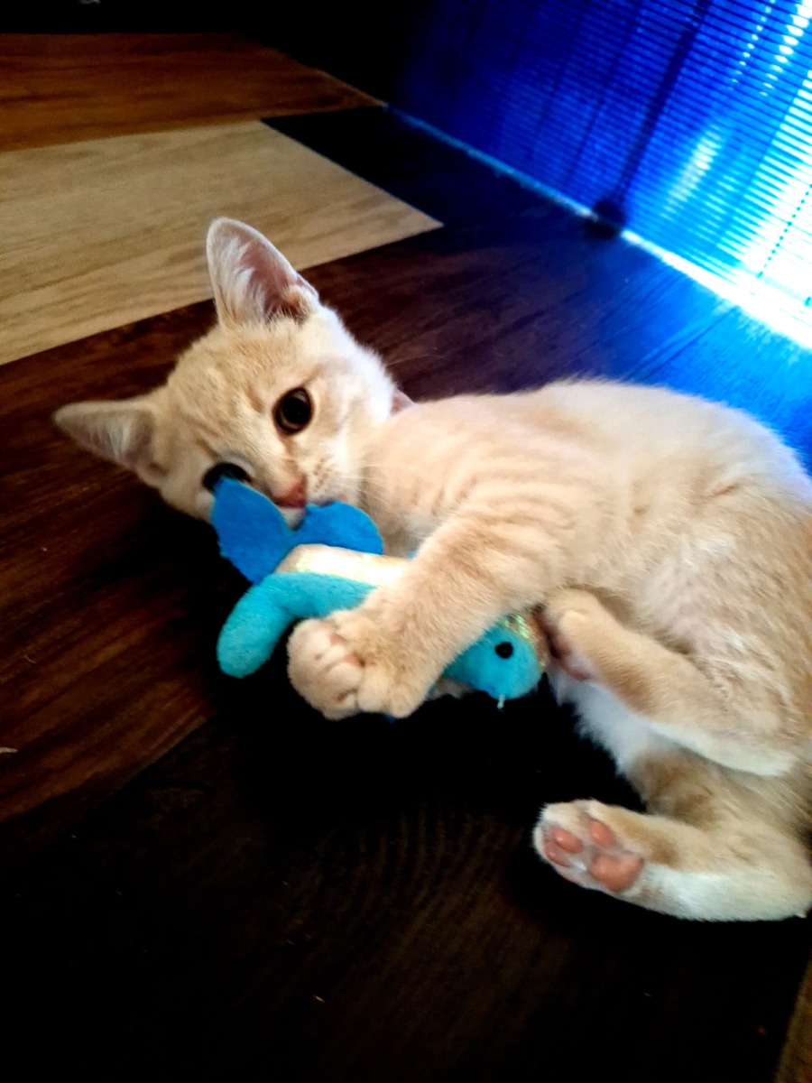 Chester's playful spirit shines through when he's interacting with his siblings and playing on his beloved scratch pole. He's a social cat who's great with other housecats, happily engaging in playtime and shared naps. While he's indifferent to dogs, he remains calm and composed, making him adaptable to households with both cats and dogs.