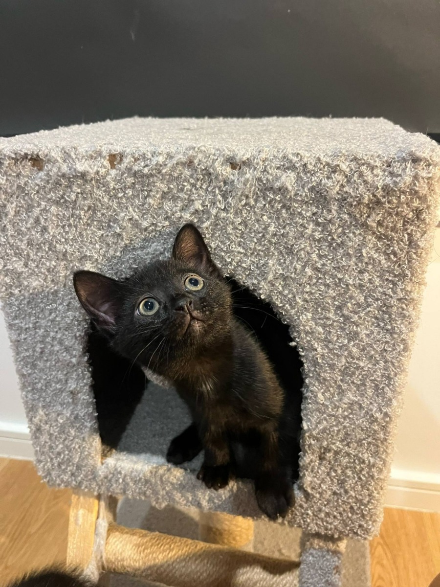 Say hello to Pearl, a petite beauty with sleek black fur and a heart full of quiet charm. Pearl may be small, but she carries herself with a quiet grace that makes her truly special. While her siblings tumble and pounce, Pearl is just as happy batting around her favourite toy or curling up nearby, enjoying her own little world.