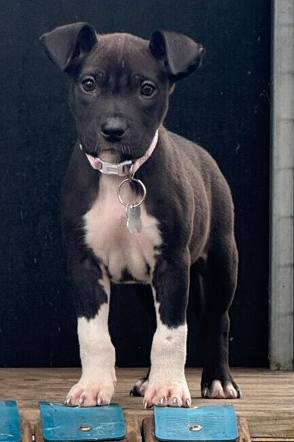 Mrs Scrubitt is the queen of gentle cuddles, spontaneous play, and rolling over with her feet in the air like a tiny upside-down teddy bear. She's a natural explorer who isn't fussed by water and will gladly chase after a ball-though she may be just as happy snuggling up and letting her siblings do the heavy lifting.