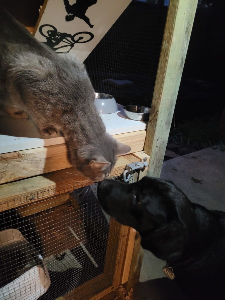 Winston has interacted with my adult Labrador dog and my own cats and has been very friendly with them. Also sees my chicken from his cage and is fine with it. He has not got a mean bone in his body.