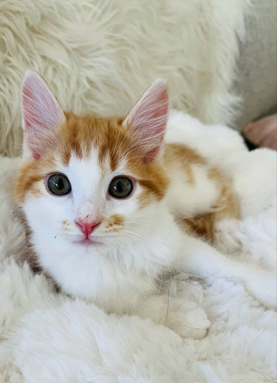 Koba is a gorgeous white and ginger boy with a big heart to match his big size — he’s the largest of his litter! This confident little explorer is full of personality: he's the bravest of the bunch, a lightning-fast escape artist, and a loud, proud purring and machine, who has the sweetest meow. Koba adores attention and would love nothing more than to cuddle up in your arms or fall asleep on your lap, giving you kisses after a session of zoomies and playtime (especially if a toy mouse is involved!).