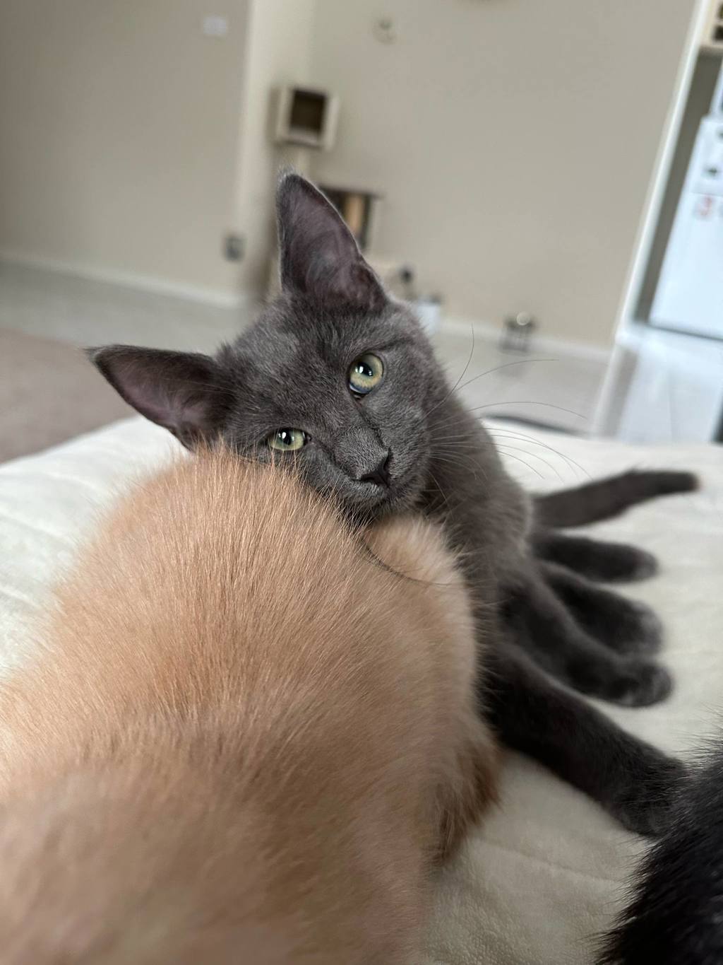Dipsy is a soft, snuggly boy who wants to be your boy. If you're sitting down, he's already planning how to sprawl across your lap or chest. Like his siblings, he's got that signature 'floppy kitten' vibe-totally relaxed when held and happiest when glued to his humans. He took a few days to settle in, but once he did, his affectionate nature came flooding out. He's not shy about introducing himself to new people either and will happily ask for cuddles from strangers. Oh, and he really loves food-he might be the first one on your dinner plate if you're not careful!
