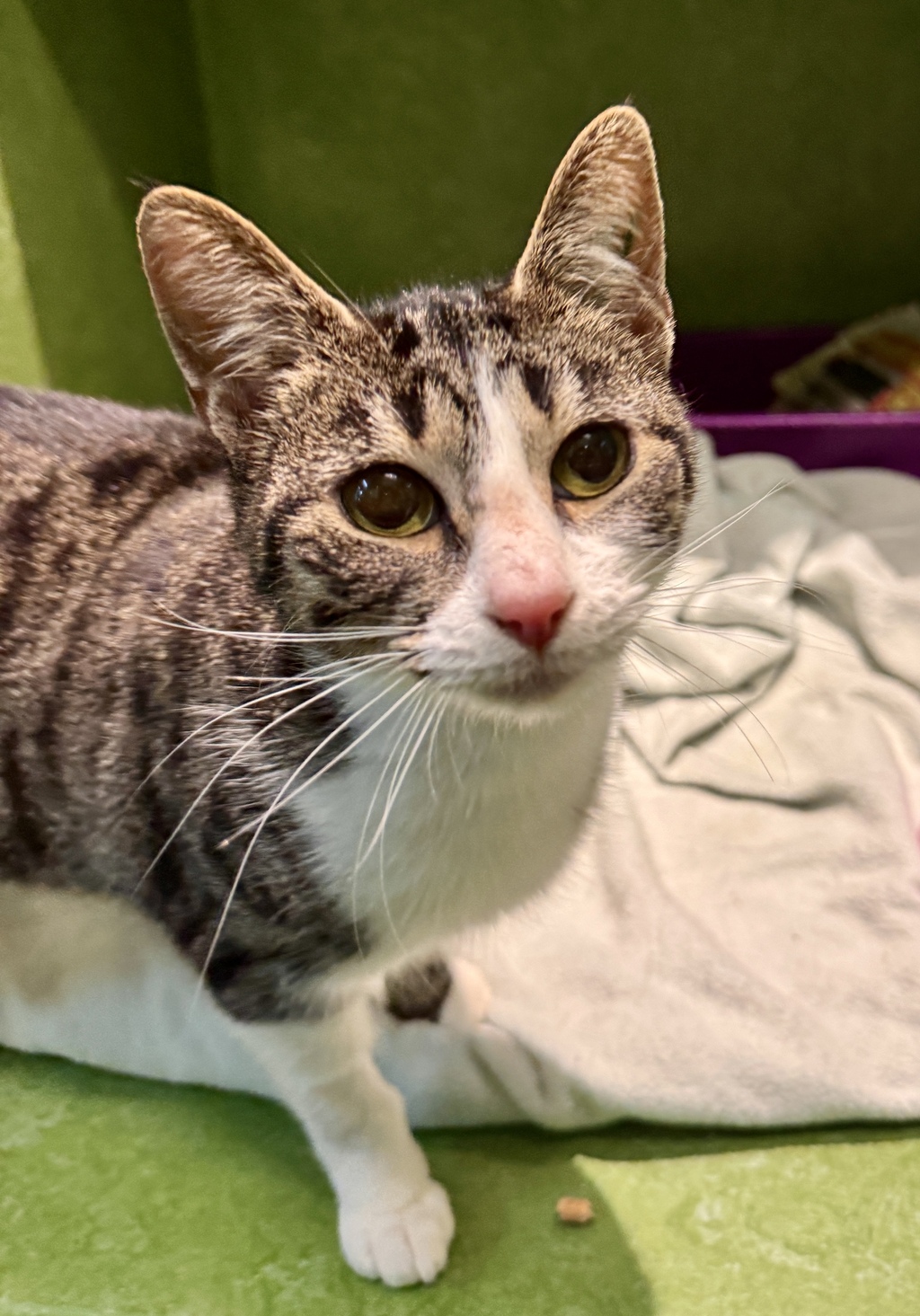 Elide is a lovely young girl with a soft heart and gentle spirit. Though she may be a little shy at first, with patience and love, she'll begin to show you her true colours. Once Elide feels safe, she becomes wonderfully affectionate, playfully curious, and even a little chatty. Elide is looking for a calm, indoor only home with teens or adults who understand the magic of routine and the joy of quiet companionship. With consistency and a peaceful environment, she will blossom into your sweetest shadow. She's also an enrichment enthusiast! Think cozy hideaways, scratching posts, multiple high places to perch, and wand toys to chase. Watching her come out of her shell and reveal her playful, loving side is a truly heartwarming experience. Elide may also do well with a friendly feline companion, given slow, considered introductions.
