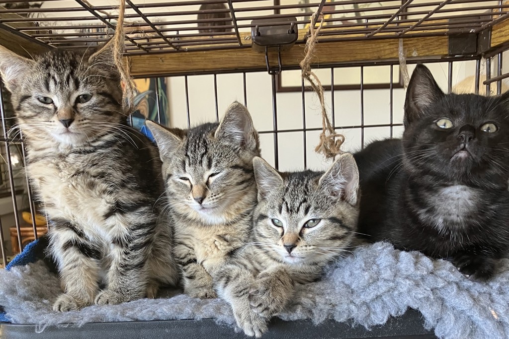 Meet the M litter! Manfred (black) and his tabby siblings Max, Muriel and Mildred are chubby, sweet and very cute kittens but still a little shy.