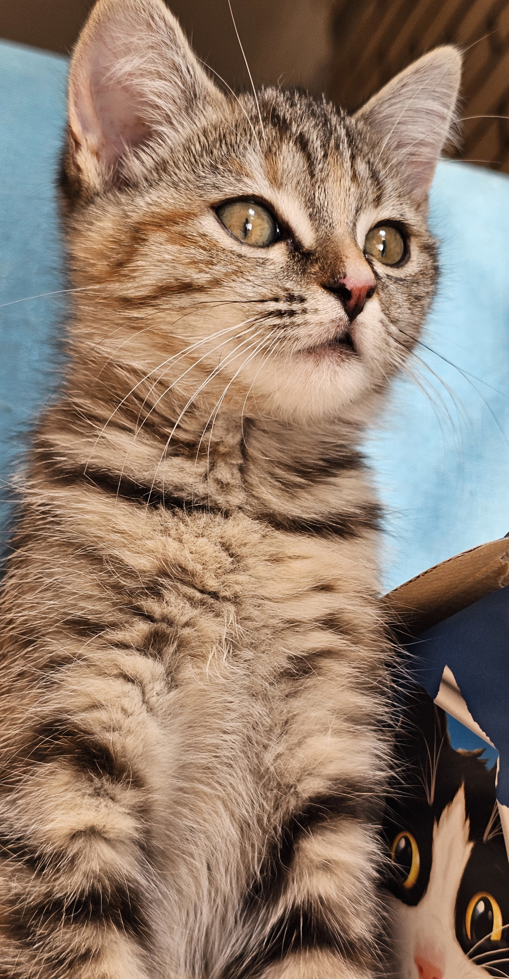 A 9-week-old female kitten with a heart as sweet as her name. Cinnamon was found dumped in a box with her two siblings, yet all three are so full of love and want nothing more than to be with you! Cinnamon is affectionate, gentle, and playful-she loves making biscuits and curling up in bed for cuddles. She gets along well with both cats and dogs, making her the perfect addition to any loving home.