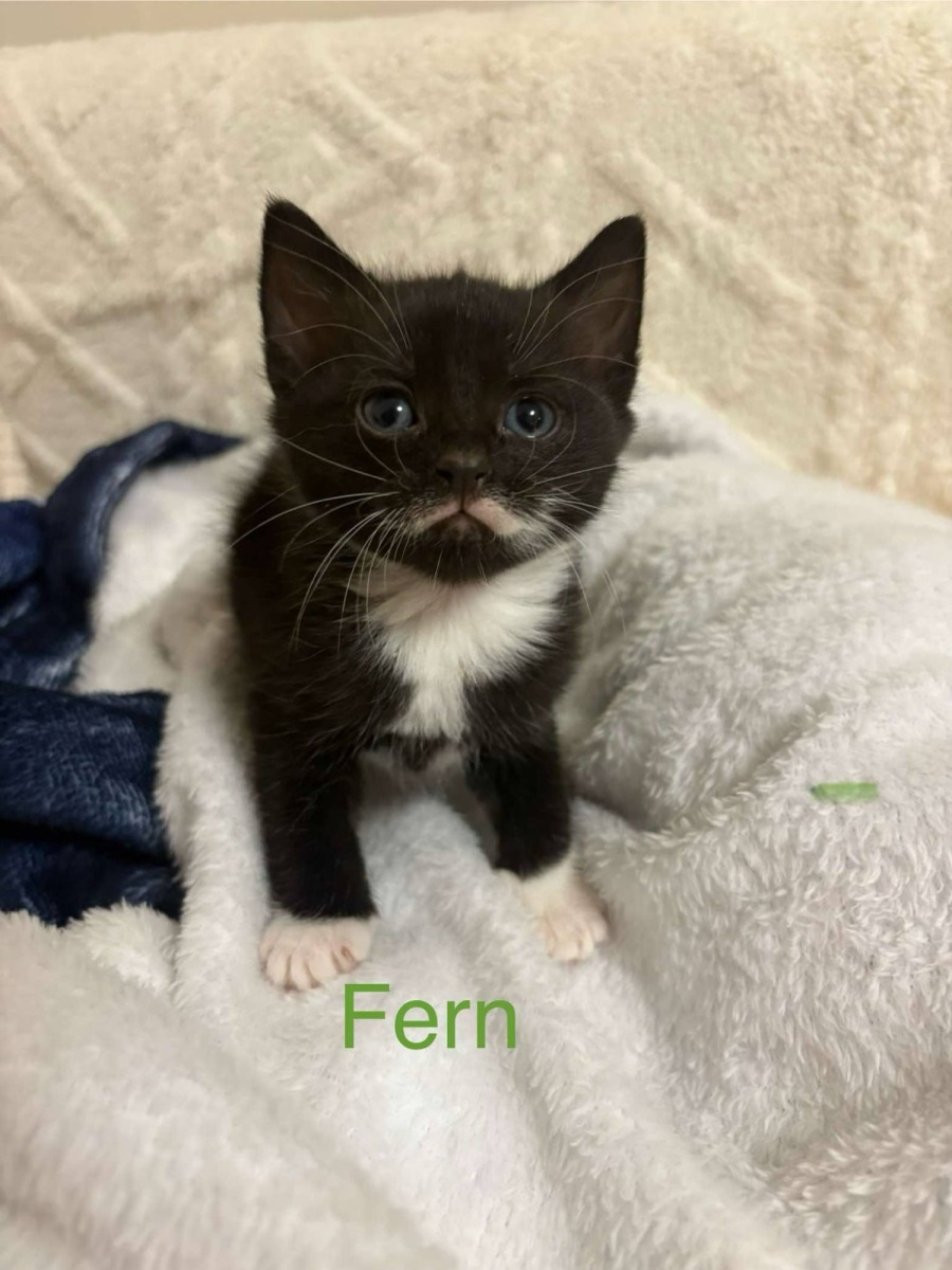 Introducing Fern, a delightful six-week-old female Domestic Shorthair kitten who is now open for pre-adoption. She will be ready to join her loving new family at the end of May, and she brings with her a world of love and charm. Fern's early weeks have been filled with nurturing care, ensuring she is well-socialized and ready to take on the adventures that come with a forever home.