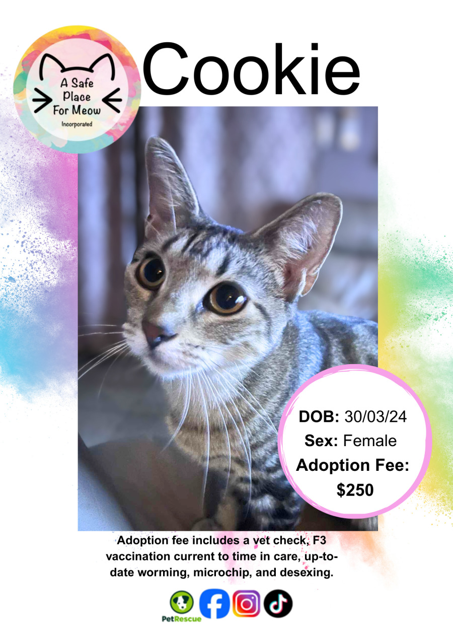 Meet Cookie, a truly remarkable and nurturing feline who has devotedly raised three adorable kittens, ensuring they were loved and well-cared for. Now that her little ones have found new homes, Cookie is ready to bring her loving spirit to a supportive and welcoming family.