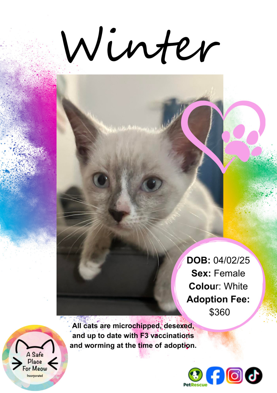 Winter is as sweet as they come—this bundle of fur adores cuddling up on a cozy lap and is always ready to shower you with affection. Their playful side adds an element of fun to their endearing personality, ensuring that playtime is always a joyful experience. Whether it's batting at toys or chasing a bit of string, Winter's playful antics are sure to bring a smile to your face.