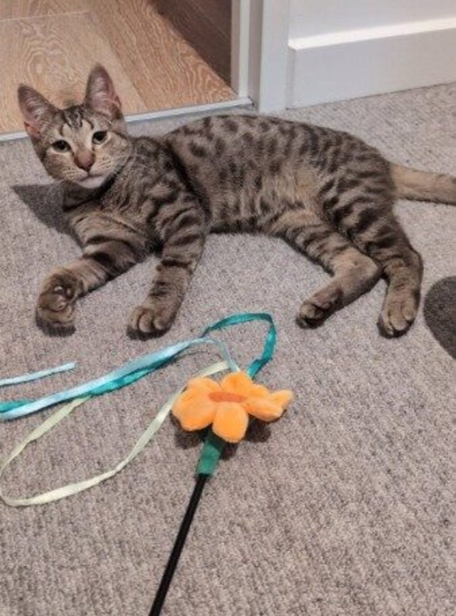 He’s slowly building trust and gaining confidence every day. Spongecake enjoys exploring, playing, and following the other cats around like a curious little shadow. They’re helping him come out of his shell, and it’s clear he enjoys their company.