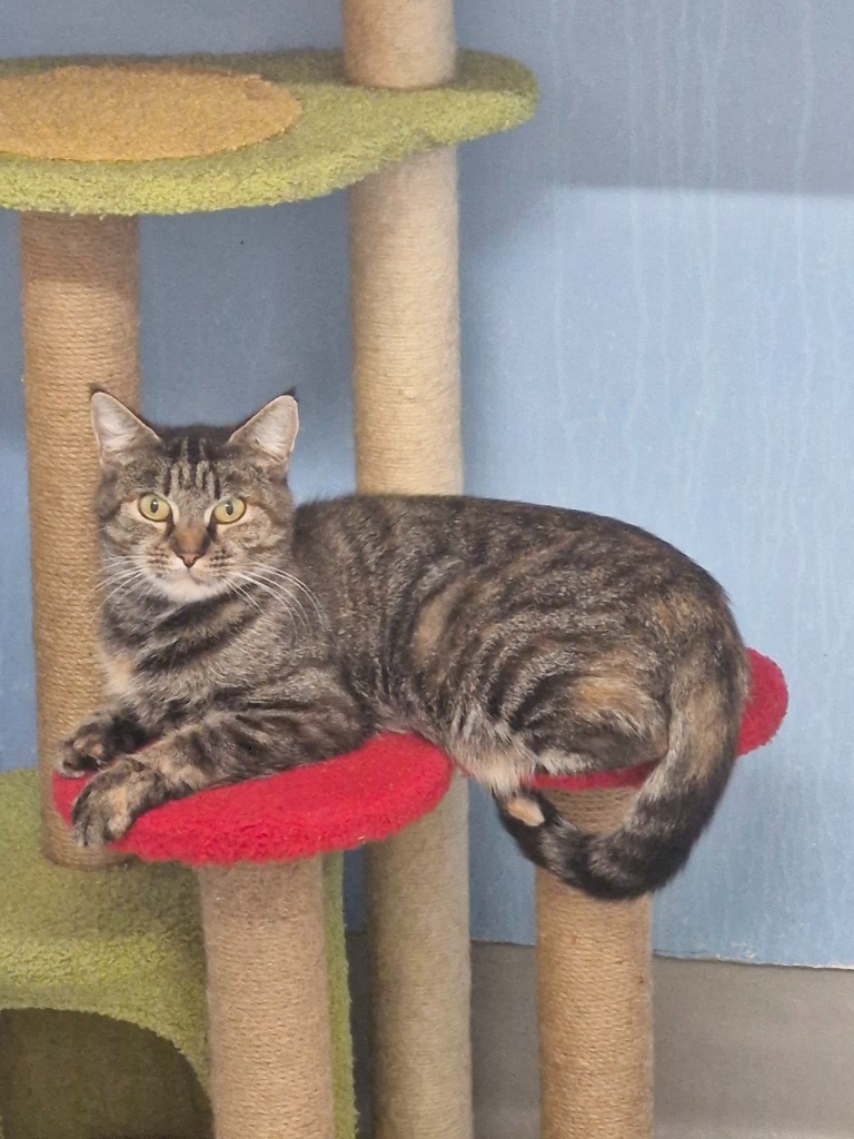 Mildred's journey began when she was found as a stray, caring for her kittens. Despite the challenges she faced, Mildred's nurturing spirit shone through, ensuring her little ones were safe and loved. Now that her kittens have grown and found their own paths, it's Mildred's turn to be cherished. She is a confident and playful girl who delights in the simple pleasures of life—chasing her dry biscuits, watching birds from a sunny window, and sharing quiet moments with her human companions. Her soft meow and affectionate nature make her a comforting presence in any home. Mildred enjoys following her people around, settling into the room they're in, and receiving gentle strokes along her body.