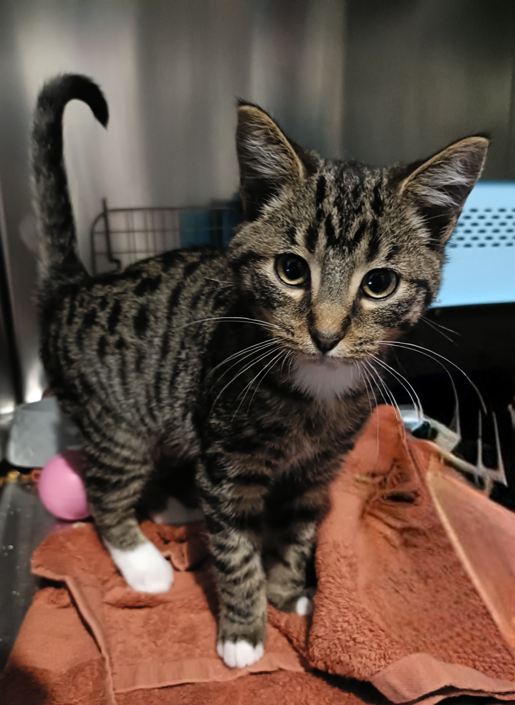 Meet Scotty, a quiet little sweetheart with a gentle soul and playful spark. At just 3 months old, this tabby-and-white kitten is the perfect mix of calm and curious-he loves a good nap just as much as a good play session!