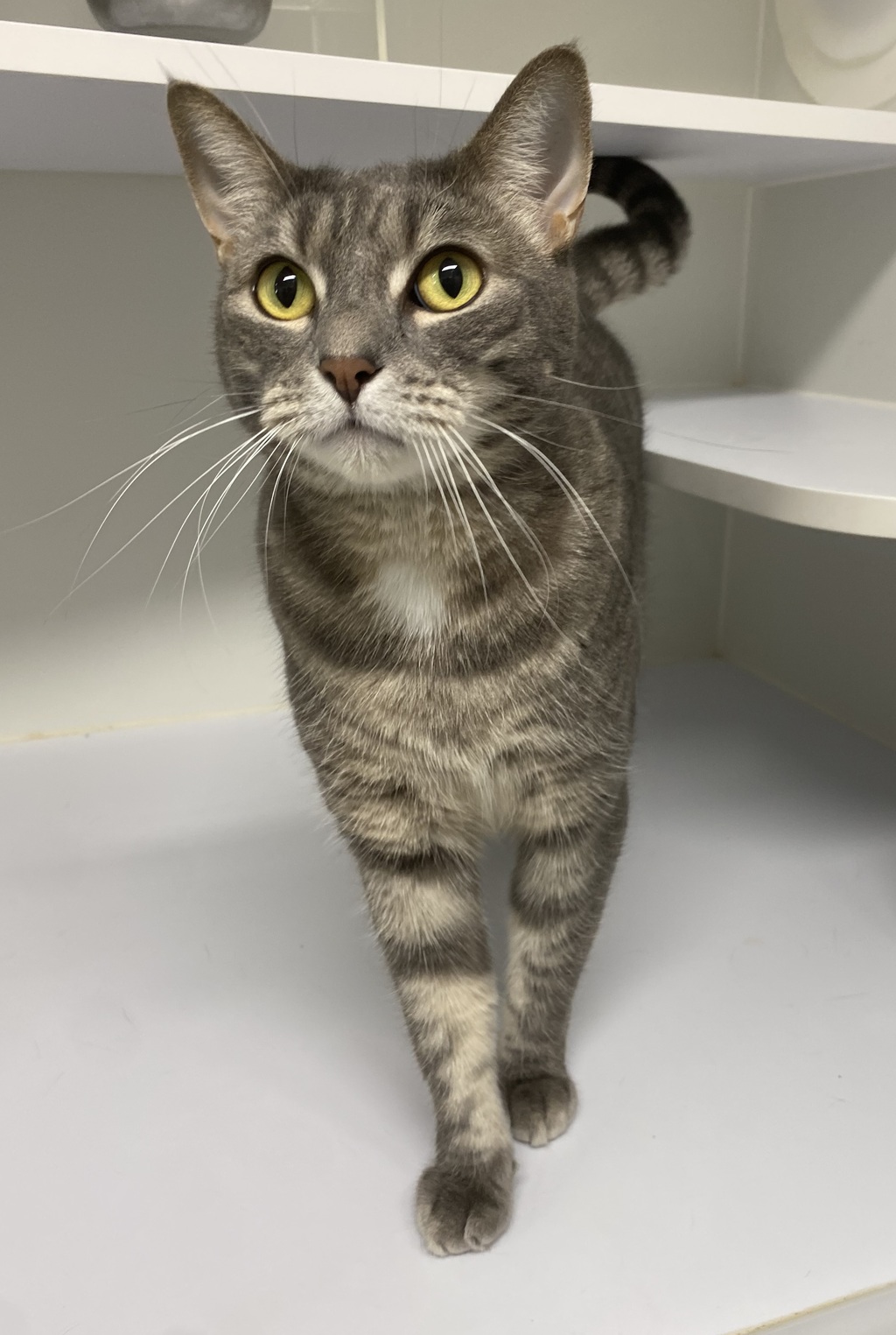 Kitty is a beautiful and gentle girl searching for her forever family. With her affectionate nature, she delights in receiving pats and will often nudge you with her head, inviting more attention. While she has a calm demeanor, she becomes a bit chatty when it's mealtime, expressing her excitement with soft meows.