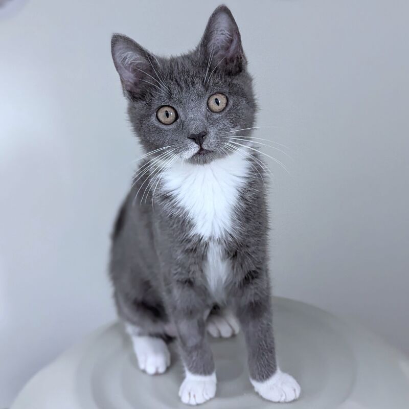 Hello there! My name is Mabel, a sweet and petite 3-month-old domestic short hair kitten. I may be young, but I have lots of love to give to my forever family. I'm a lady who knows what she wants - a quiet and calm household where I can curl up for a snooze in a cozy corner or a warm lap. I dream of a home where I can mature into a beautiful feline, and be your loyal companion for many years to come. I might be small, but my heart is ginormous, and I can't wait to shower you with purrs, head-butts, and lots of affection. I'm quite the charmer and I promise you'll fall in love with me in no time. As a young kitten, I'm still learning about the world and would love a patient adopter who has experience with kittens. I'll need a friend who can help me grow into a well-behaved adult cat and hold my paw through all my milestones. If you're looking for a calm, loving, and adorable little girl to add to your peaceful home, I'm your kitten! I can't wait to meet you and start our forever journey together. Will you be