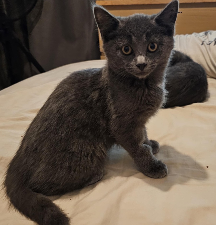 Parkes is a strikingly handsome grey kitten with a sleek coat and a personality full of sparkle. This sweet boy is an all-around charmer, affectionate, friendly to everyone he meets, and always ready for a cuddle. The moment you pick him up, the purring begins!