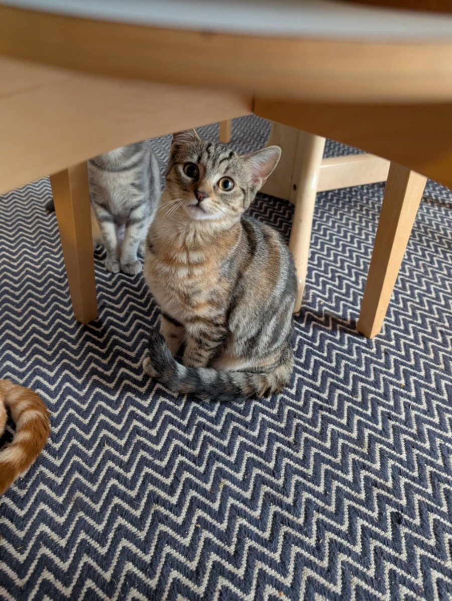 Doughnut is the kind of kitten who will gently steal your heart with her quiet charm. She has the most adorable, innocent eyes and a soft purr that starts the moment you look her way. She's a gentle soul, happy to be held and snuggled close, often melting into your arms with a sigh of contentment.