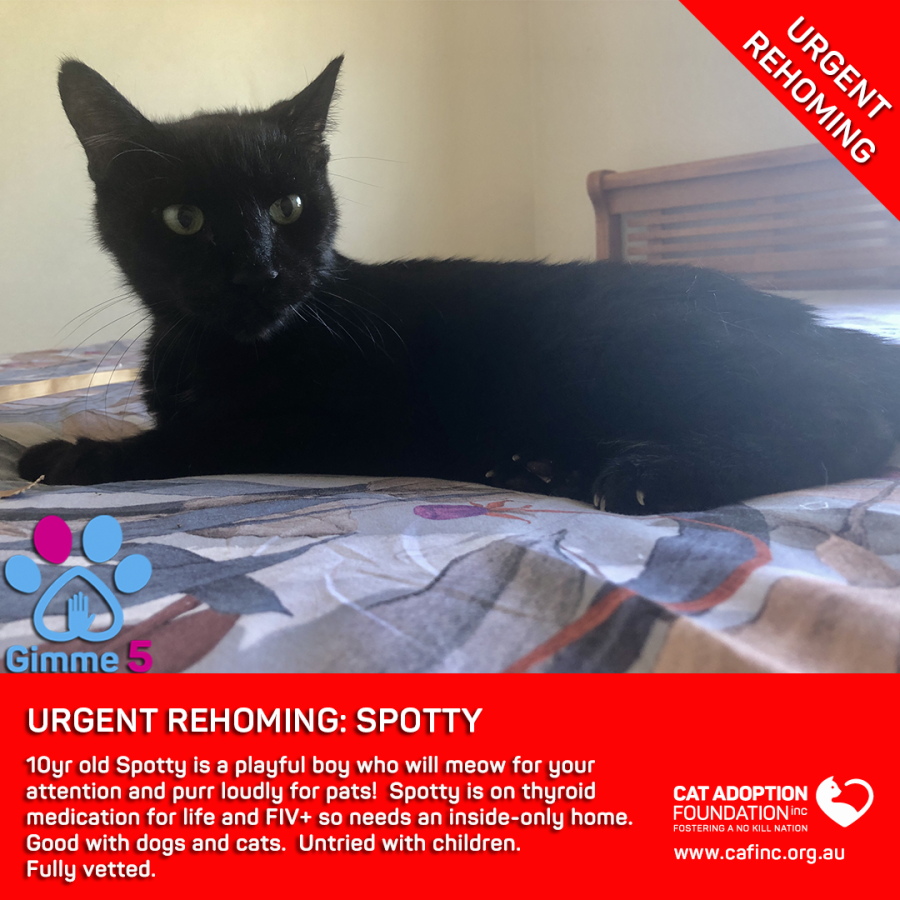 10yr old Spotty is a playful boy who will meow for your attention and purr loudly for pats! Spotty is on thyroid medication for life and FIV+ so needs an inside-only home.