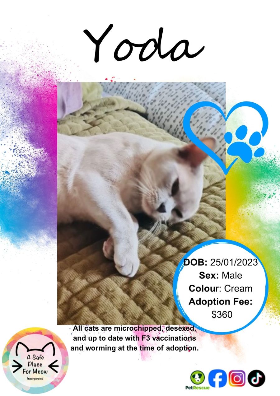 If you're seeking a sophisticated and peaceful feline partner who appreciates life's subtler moments and offers a beautiful, calming presence, Yoda is ready to fill your home with warmth and quiet grace.