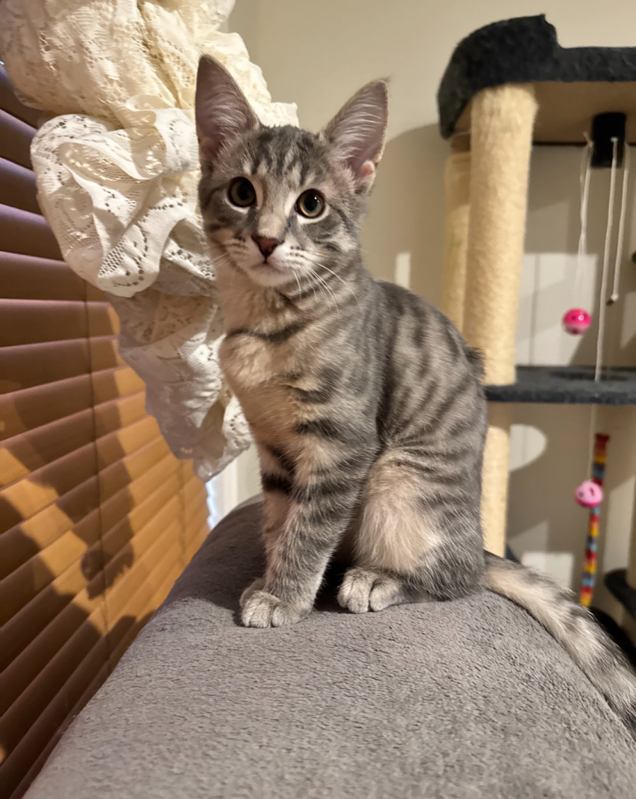 While his brother Chester has found his forever home, Freddie and his sister Susie are now ready to bring their unique brand of love and mischief to a new family. Freddie, the distinctive âmiddle childâ with his shorter, lighter coat adorned with playful spots (a charming contrast to his siblings' stripes), is a whirlwind of confident energy. His adventurous spirit shines through in his playful antics, yet his heart truly belongs right by your side for a comforting nap or gentle, loving scratches.