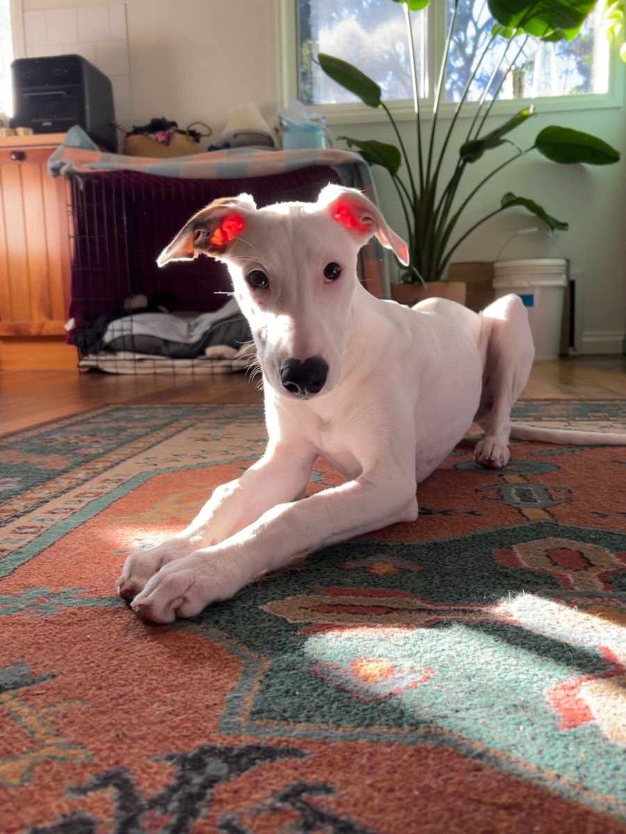 Angel isn't just her name - it's her whole personality (with a healthy dose of cheeky puppy energy for good measure). This gorgeous 5-month-old Whippet x Greyhound x Bull Terrier is equal parts zoomies and cuddle puddle. She's lightning-fast on her paws but just as quick to melt into a couch snuggle like a seasoned pro.