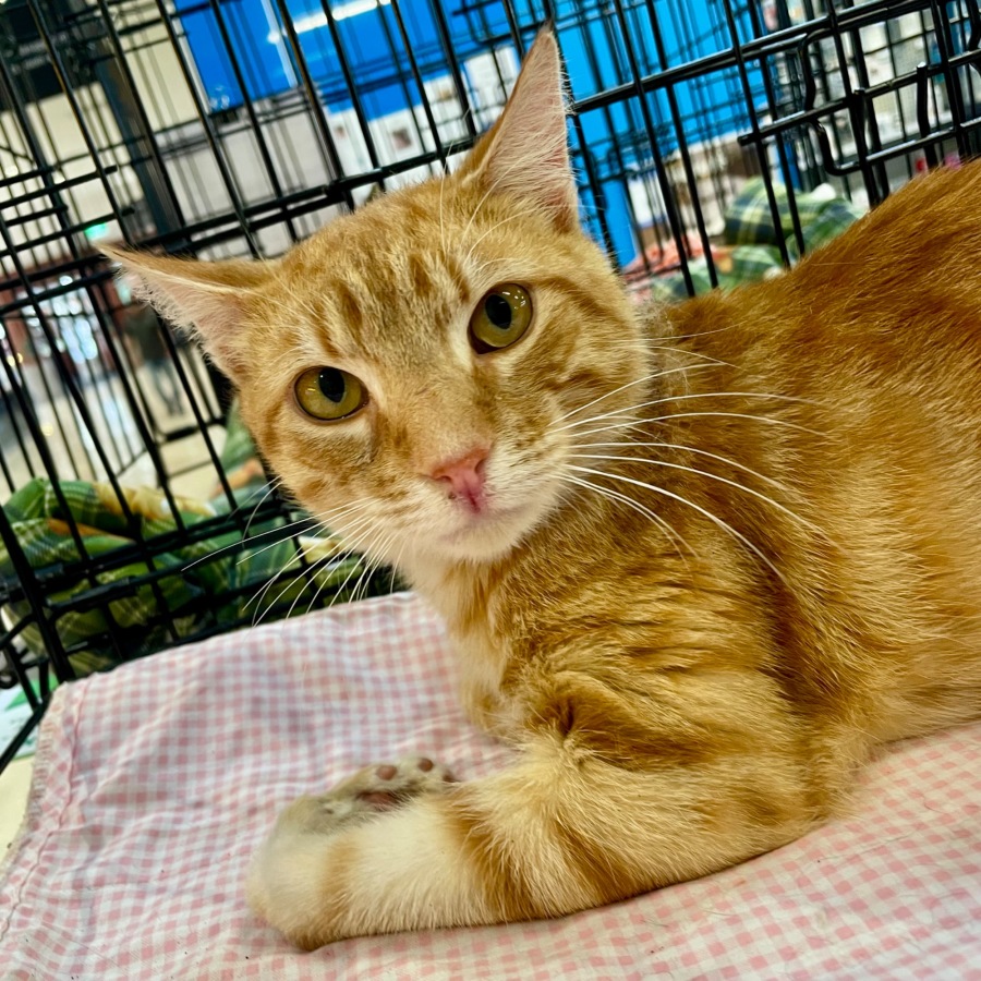 Douglas is a Domestic Shorthaired Ginger cat. He has tabby stripes. Ginger cats are often very lovable and happy to laze around and mostly care for themselves.