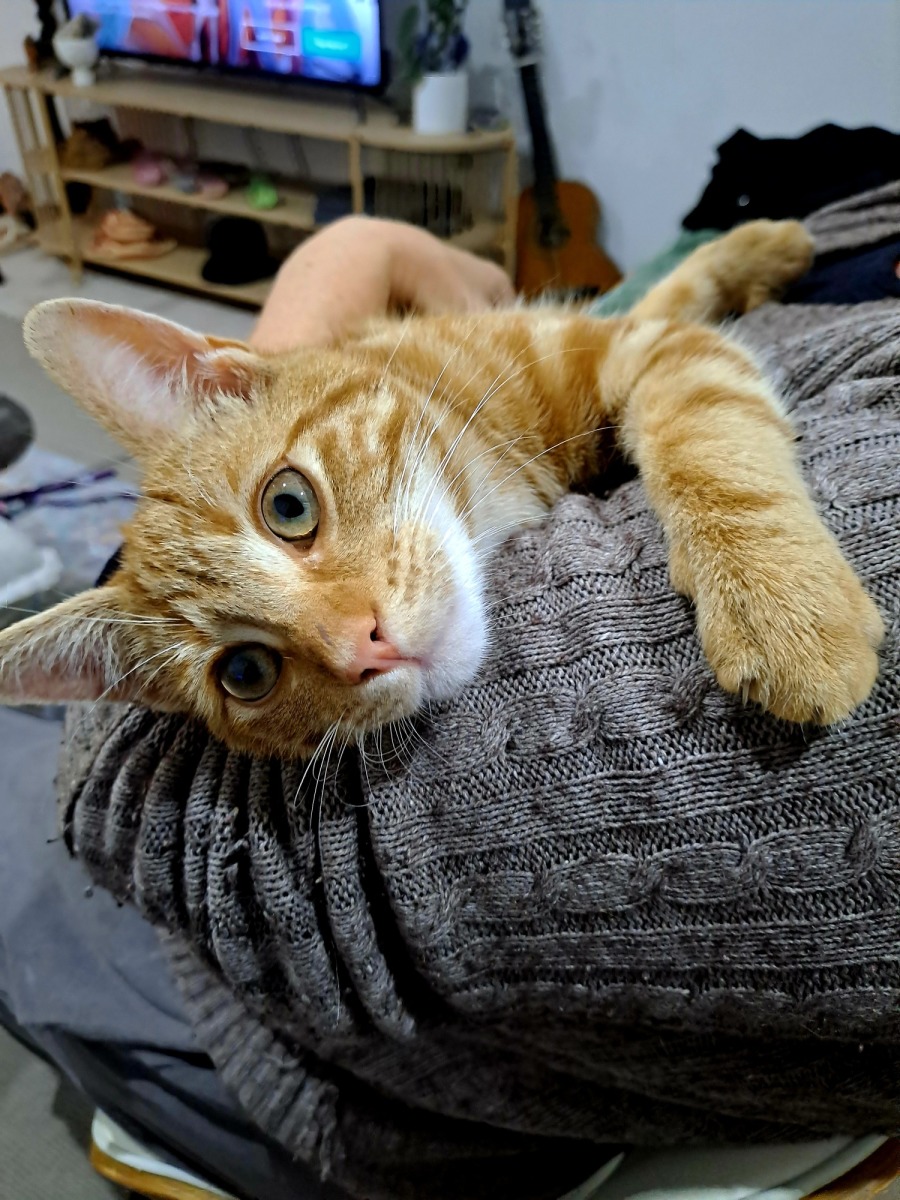 This happy fellow is pretty much the perfect cat - cheeky, curious and playful, but also a super-smooch who likes getting cosy with his humans and feline pals. Playtime, mealtimes and cuddle times on the couch are his favourite things in the world :)