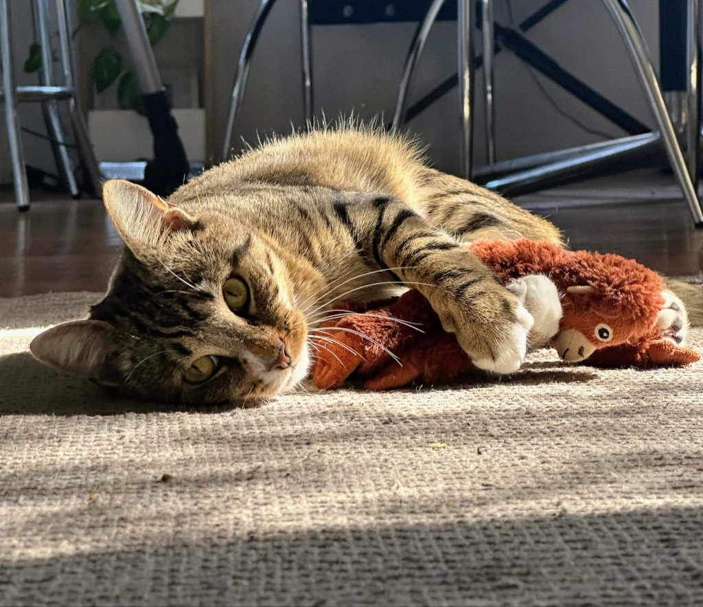 While a little shy around new people, Jaeger warms up when he feels safe—especially on your bed, which he’s claimed as his comfort zone. He has a soft, sweet purr that kicks in when he’s relaxed and enjoying attention. He’s also quite the communicator, meowing when he needs something or wants help exploring a new room.