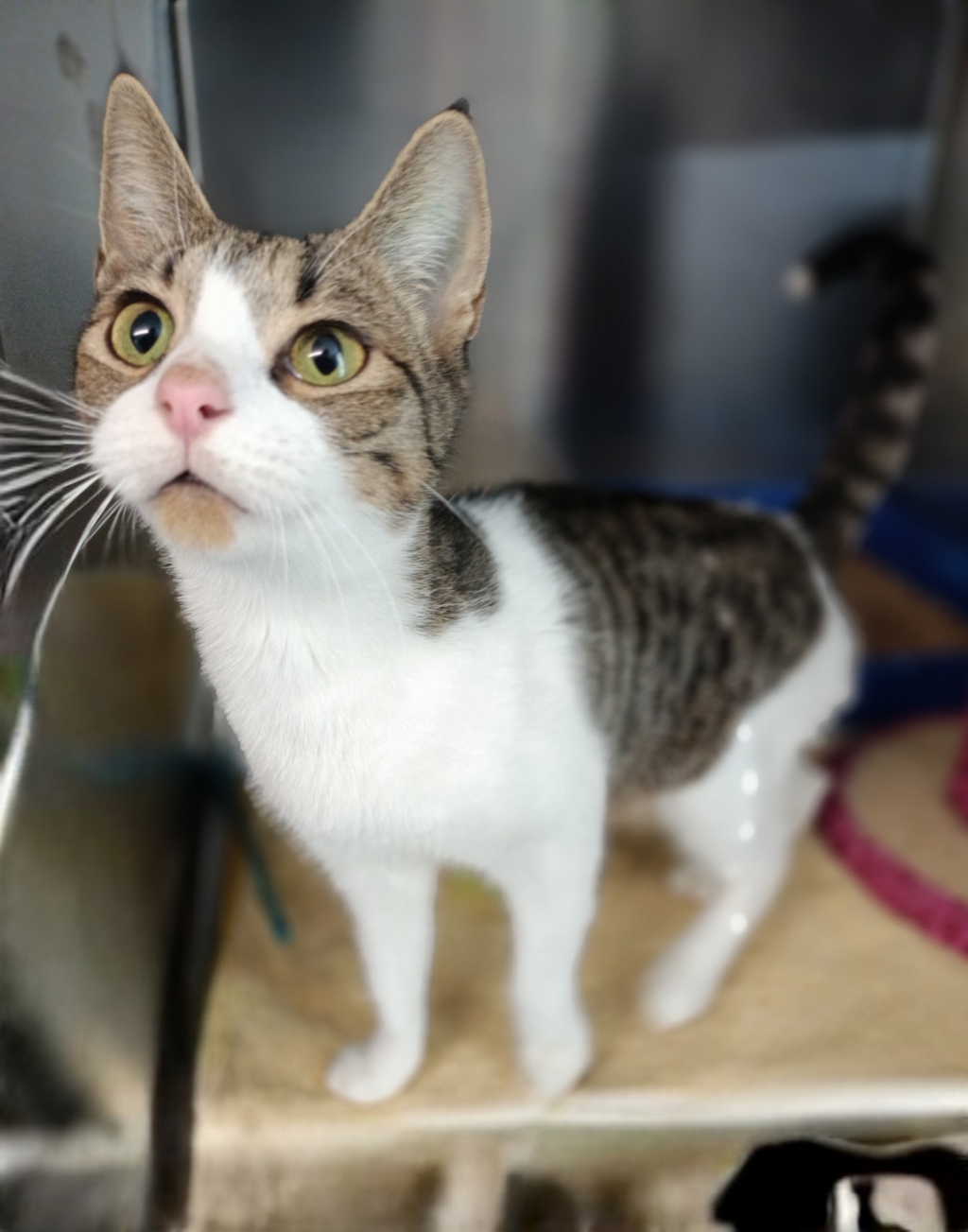 Meet Trish, a stunning young female tabby and white cat who's ready to embark on a new chapter of her life. Having recently raised a large litter of adorable kittens, Trish has proven to be an attentive and loving mother. Now, after being desexed and taking some time to nurture her little ones, she is eager to find a forever home where she can relax and enjoy all the love she deserves. Her beautiful coat is a testament to her good health, and her friendly demeanor makes her an easy addition to any family.