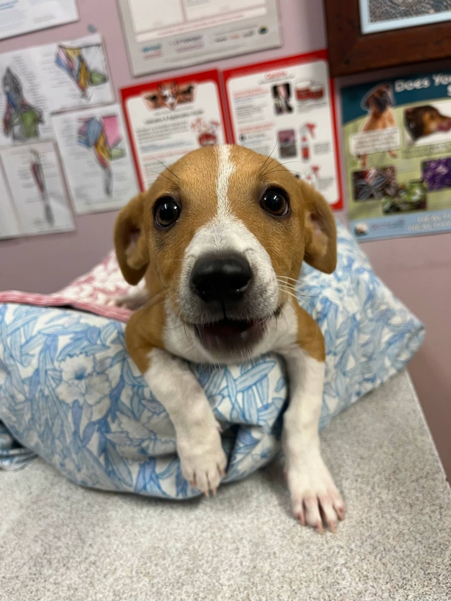 Russel Sprout appears to have a bit of Jack Russel in him... however he has a very long body and we can't 100% guarantee his breed. He will be a small-medium sized dog when fully grown.