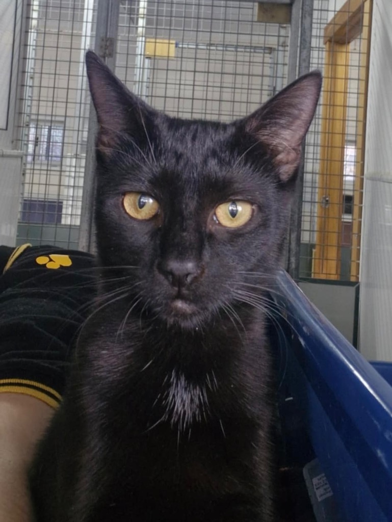 Smitten is a 7-month-old black kitten whose name perfectly captures how you'll feel once you get to know her. Though she may be reserved at first, with time and gentle care, Smitten reveals her loving and playful side. She thrives in a calm environment where she can build trust at her own pace. Smitten is great with other cats, untested around dogs but wiht a slow introduction may be ok. Smitten loves her sister Tingle and would love to find a home with her.