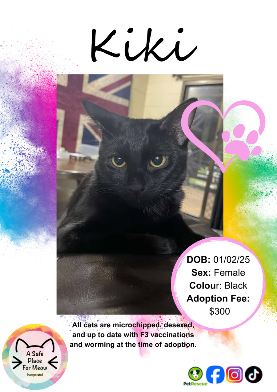 Kiki is a stunning black beauty with a glossy coat and soft golden eyes that seem to glow with affection. She’s a gentle and affectionate cat who’s ready to find a forever home to call her own.