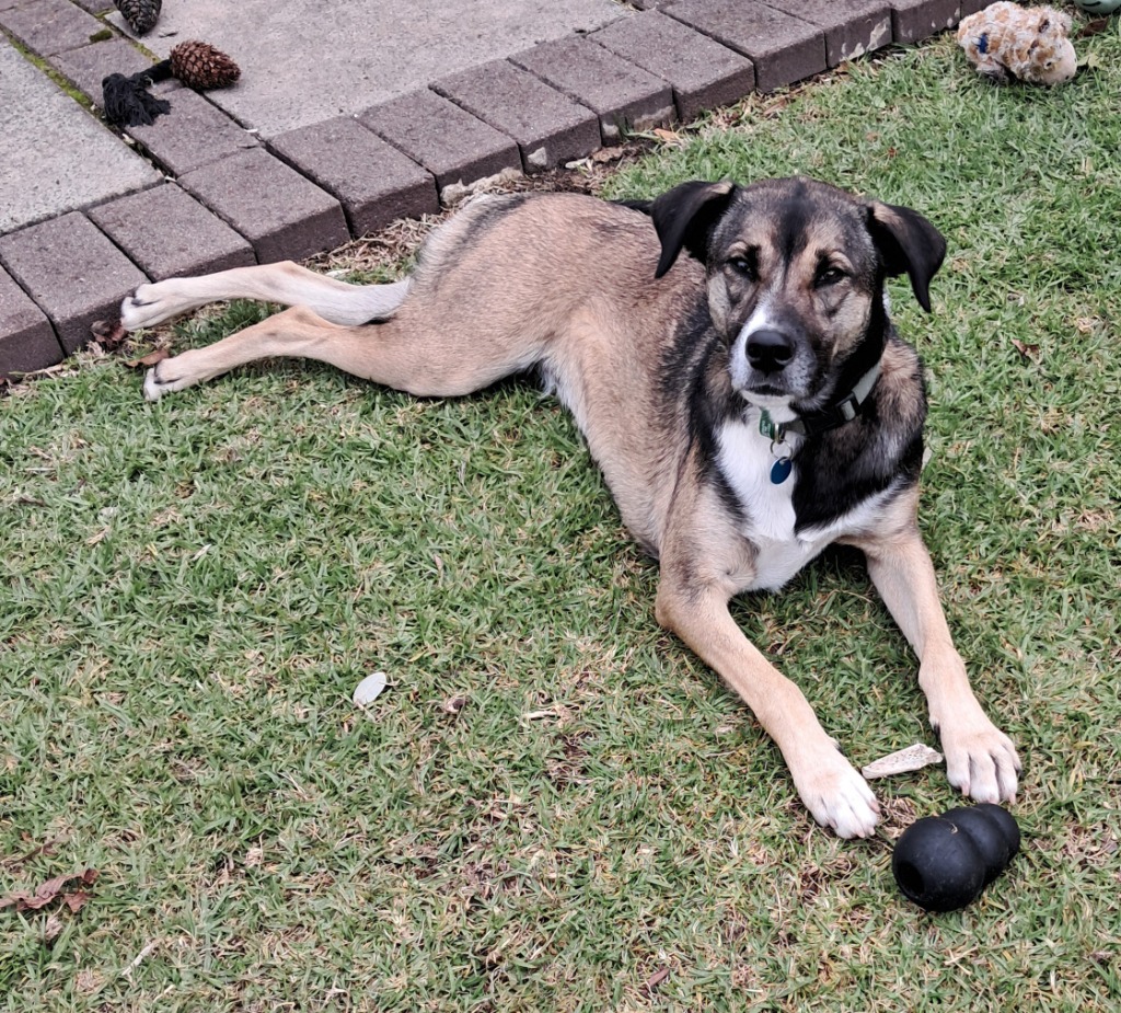 Mocha is a very friendly medium-sized dog (22kgs), who loves to be active, enjoying her walks and meeting people and other dogs. While she loves mixing with her canine friends, she is just as happy amusing herself with her toys or just hanging out with her human buddy. Riding in the car and playing on the beach is something she loves to do. She has good recall, really enjoying stretching out and running around a footy oval.