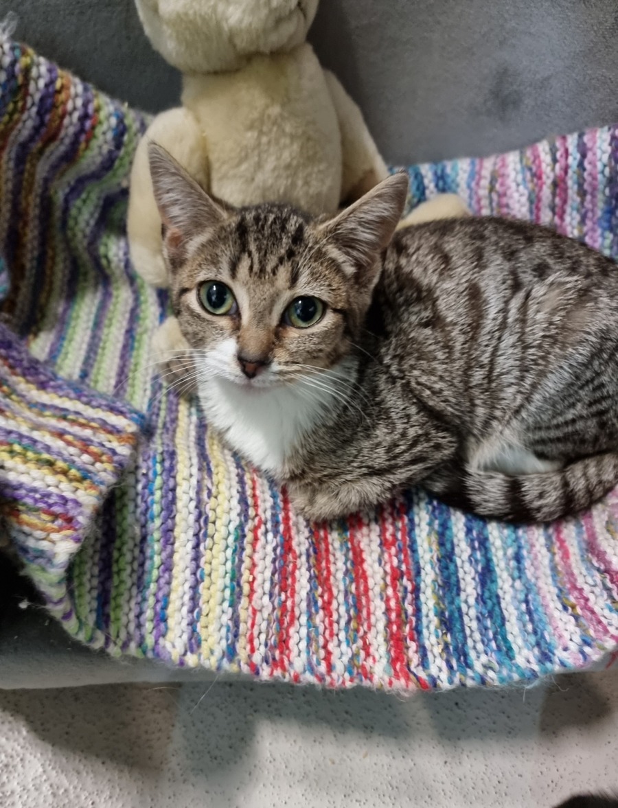 I am a bit of a quiet kitten who enjoys having cuddles with you and snuggling up in my bed. I just have lots of love to give someone! I also like having a playtime with my toys.