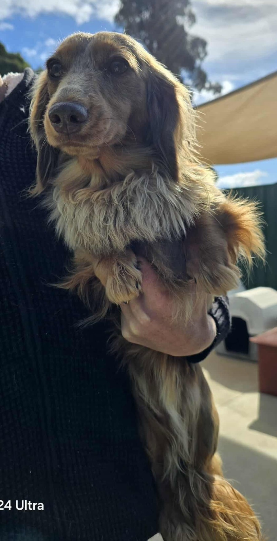 Meet Sadie, a sweet and gentle 3-year-old Dachshund with a heart full of affection. Sadie is a reserved and quiet girl, preferring the tranquility of a peaceful home where she can feel secure and loved. Her calm disposition makes her an ideal companion for those who appreciate mellow moments and gentle companionship. Sadie enjoys being near her human companions and will quickly become your steadfast shadow, providing quiet comfort with her presence.
