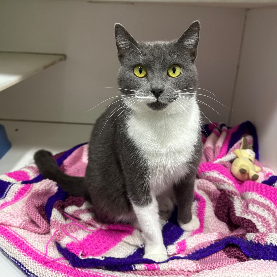 Looking for a feline with movie star looks and a heart of gold? Say hello to Gina – a stunning grey and white beauty with the kind of striking gold eyes that could stop traffic (or at least make you forget what you were doing).