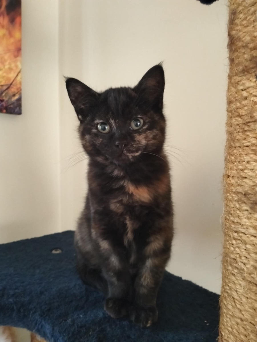 Finn may be the quietest of her litter, but don’t let that fool you—this sweet torti girl still enjoys all the fun of kitten life! She approaches the world with care and curiosity, taking her time to observe before jumping into play, climbing adventures, or cuddle time.