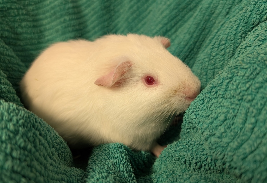 Hi there I am a sweet young guinea pig named Milky due to my beautiful white coat! I can be a little wriggly at first but give me some time and gentle handling and I will have cuddles in no time. I will need a place where I can be kept warm in winter, and cool in summer, and always have access to fresh water. I will need pellets for breakfast, a handful of greens as a treat (spinach, kale, Asian greens) and small bits of fruit (apple, pear, banana) and hay all day every day. If you like the look of me, come down today!