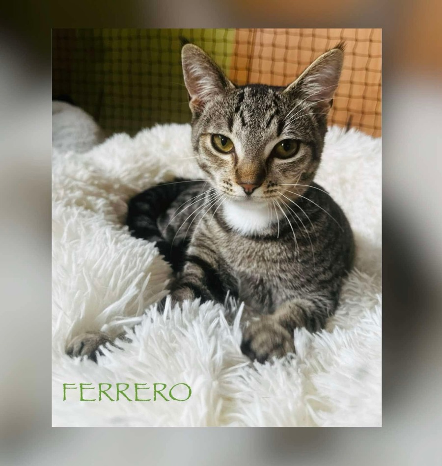 Ferrero is a handsome tabby boy with bold stripes, bright eyes, and an even brighter personality. He’s full of kitten energy and curiosity—always ready to pounce, climb, and explore every corner of his world. Ferrero is playful, confident, and loves making new friends, whether they’re human or feline. After a busy day of fun, he’s happy to settle in for a cozy nap and a few head scratches. This handsome little guy is ready to bring joy and adventure to his forever home!