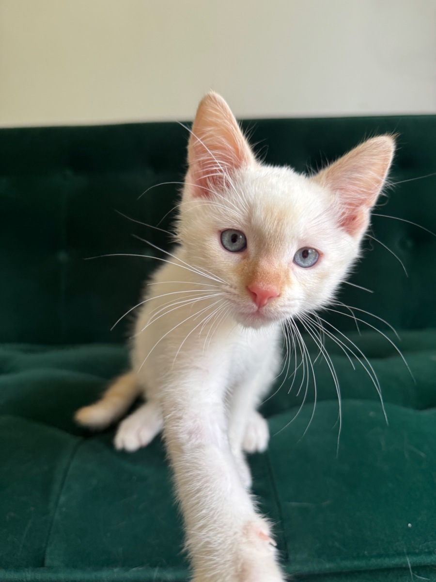 Benny is playful, curious & full of fun. You’ll catch him chasing toys, tumbling with his brother & scaling the cat tower like a tiny adventurer. But once the energy dips, Benny is more than happy to be scooped up & snuggled. He will even let you cradle him like a baby.