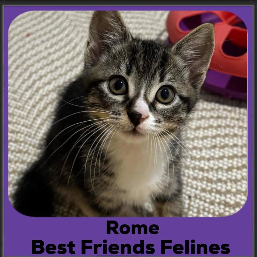 Rome is a sweet, affectionate kitten with a heart full of love and a purr that kicks in the moment he gets a pat. He’s always the first one to greet you, curling around your legs with hopeful eyes, ready for attention.