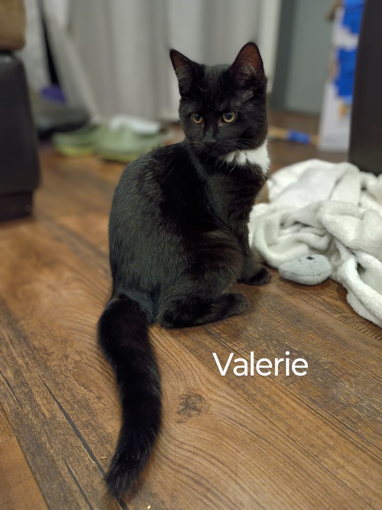 Meet Valerie, arriving alongside her siblings after they were found in a shed, they entered foster care to learn home life and are now ready to find their forever homes. This precious rockstar loves her fans and will often begin purring when you enter her presence. Valerie is warm and friendly, always up for a good cuddle, and ready to play when you are. Valerie's markings are unique, a stunning white necklace (to match her sister Melody), a few white toes on her back left paw, and, in the right light, silvery hints of a tabby pattern on the back of her head and neck. Valerie is good with other cats and kids, untested around dogs. Come and meet her at our Longford Centre.