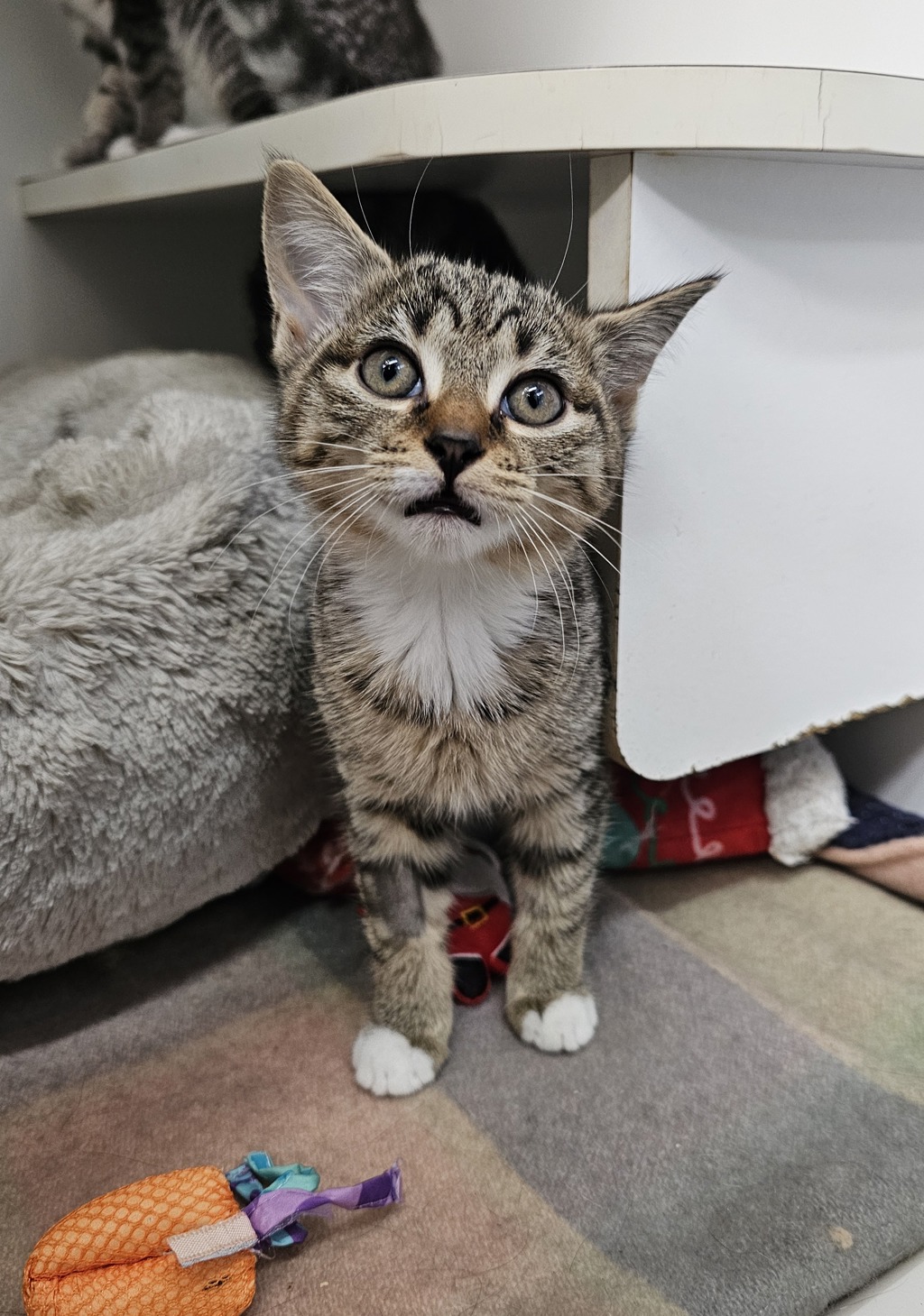 Hey there, I'm Halloumi. I'm a friendly and affectionate kitten who would suit most homes! My playful paws are always ready to pounce on anything that moves. I love playing with wand toys and mysterious shadows on the wall! When I'm finished playing, I love nothing more than finding a warm lap to curl up in.