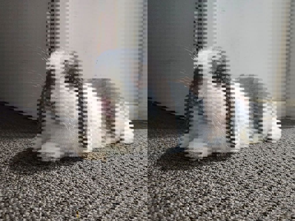Cabbage Patch is incredibly gentle and social; He loves his routine and will even stomp when it is past dinnertime to remind you. He is completely litter-trained and has never had accidents outside his litter box. Unlike many rabbits, he is not destructive and has no interest in chewing cords, carpets, or walls. He enjoys free-roaming time and explores his surroundings without causing any mischief.