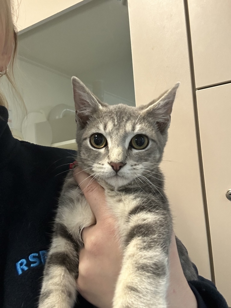 Hello... my name is Wattyl. I'm a 5-month-old grey tabby kitten with a tender heart and the quietest little purr. I'm not the boldest in the bunch-I'm more of a gentle soul who likes to take things slow. But once I feel safe, I'll lean into your touch, follow you from room to room, and melt into your lap like I've always belonged there.
