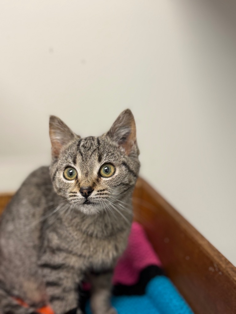 Meet Tyla, Tyla is one of those kittens who instantly lights up a room. With her classic tabby stripes, alert eyes, and confident stride, she is a perfect mix of beauty and boldness. Arriving in our care alongside her siblings, Tyla quickly made it clear that she is not one to hang back, she is curious, outgoing, and always ready to explore.