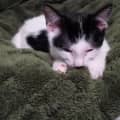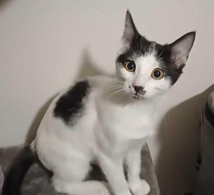 Moo female, white and black with black heart on ribs, with hazel soulful eyes, short hair kitten. Hig