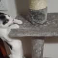 She loves to play with a variety of toys and climb cat towers and play in boxes that have holes cut into them. One of her favourite places to go too, is the top of the floor to ceiling cat tower, in the foster home. She will disappear to the top for a good nap during the day.
