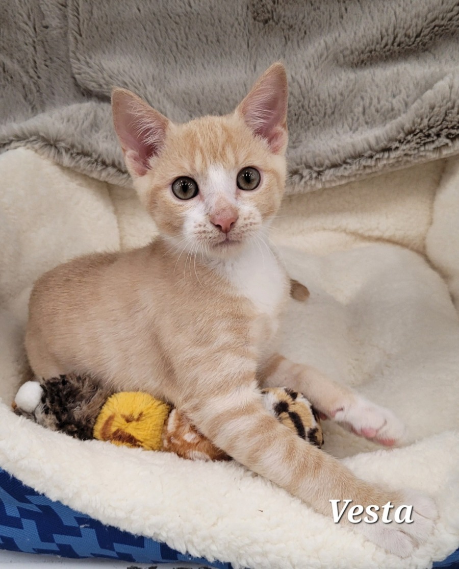Vesta. This little lad is such an adorable kitty, he loves to play with all his toys and jump around the place. He is a little purring machine, from the moment he looks at you he is purring and wanting to cuddle up to you. Vesta gets along with older cats, kittens and dogs