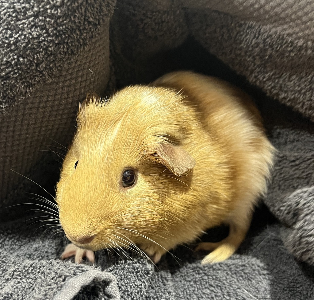 Nutmeg is a sweet and curious young male guinea pig with a gentle heart and a big personality. He loves exploring his space, munching on fresh veggies, and settling into his cozy hidey hut after a fun day of squeaking and snacking.