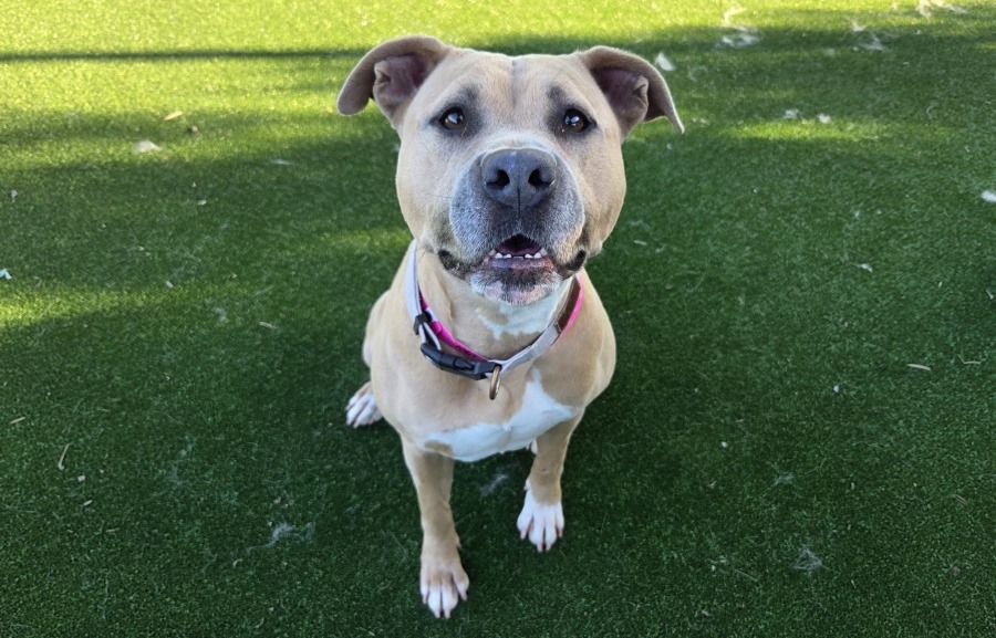 Reign’s enthusiasm and love for attention make her a perfect fit for a family with older kids who can match her energy and teach her not to jump through positive reinforcement. She’s food-motivated but needs some social skills when it comes to other dogs, so would need the right dog to teach her.
