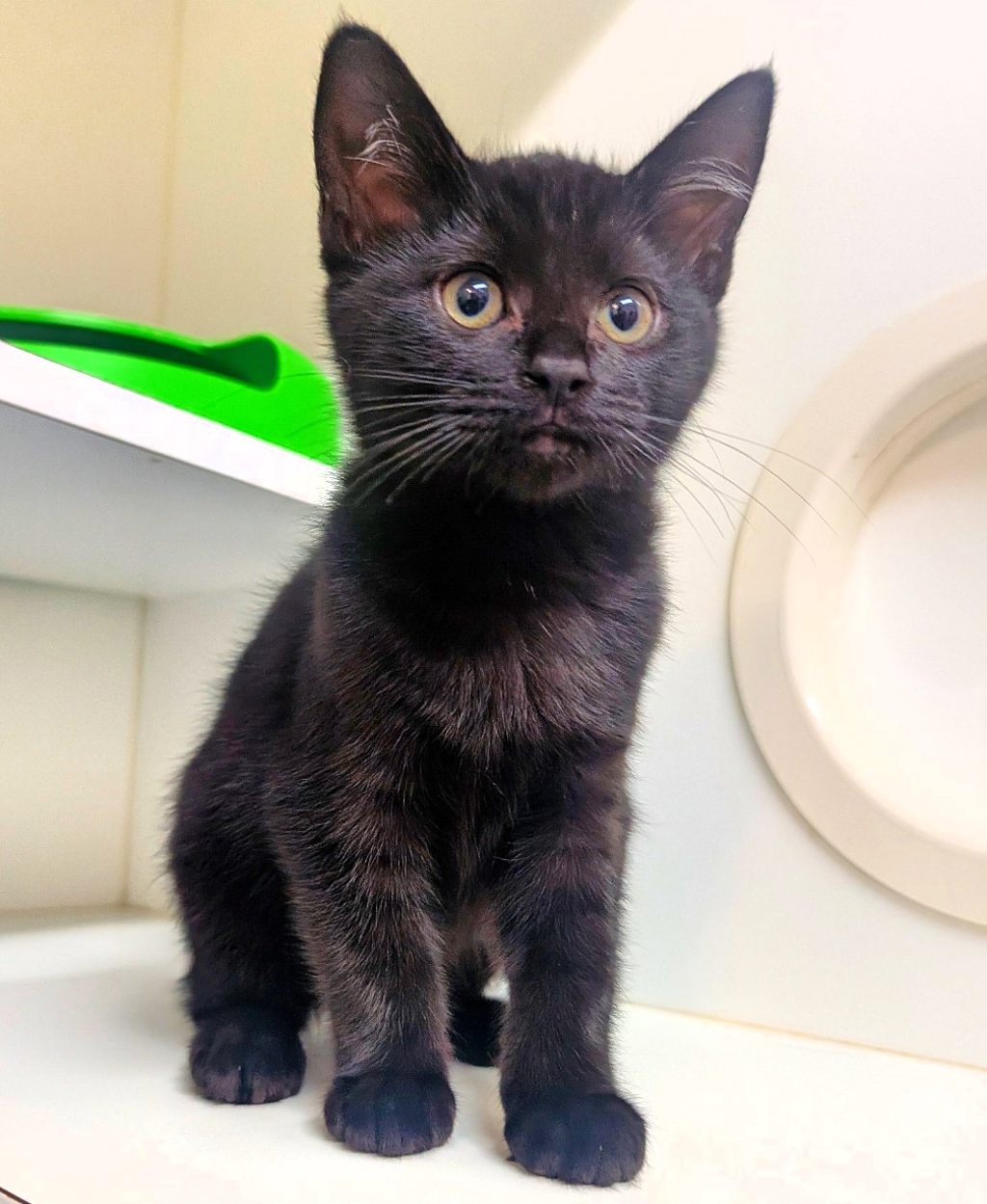 Meet Pimms Cup, a black beauty ball of energy with a heart of gold! This little kitten loves to explore, play with toys, and cuddle up for a nap. She's still learning the ropes but is quickly becoming a pro at purring and batting at anything that moves. If you're looking for a furry friend to brighten your days, Pimms Cup is the one for you.